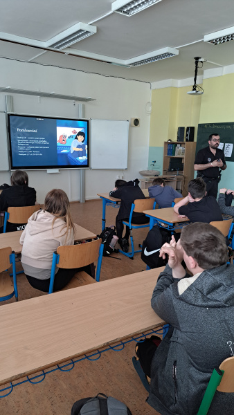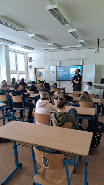Přišel k nám Bc. Martin Gryga z městské policie. Měli jsme přednášku na téma kyberšikany a bezpečného používání sociálních sítí. Po představení se celé třídy zeptal, zda máme zkušenosti se sociálními sítěmi. Diskutovali jsme o pozitivech a negativech sociálních sítí a dále nás poučil o ochraně a bezpečnosti na internetu. Jakým podvodům se máme vyvarovat a že se nemáme scházet na nebezpečných místech s cizími lidmi. Dále nás seznámil s pojmy jako sexting, kybergrooming a s trestnými následky kyberšikany. Přednáška se nám velice líbila a jsme rádi, že nás obohatil informacemi o bezpečnosti na internetu.