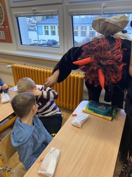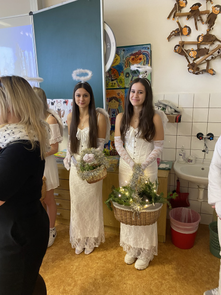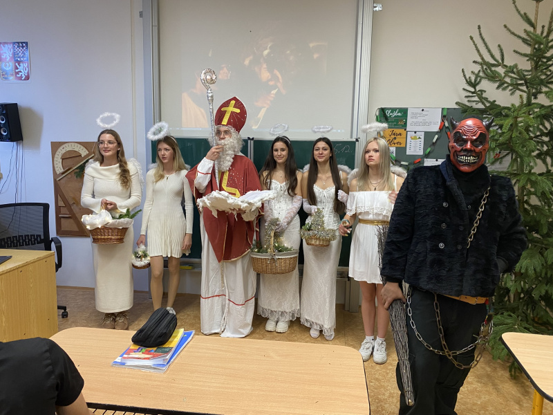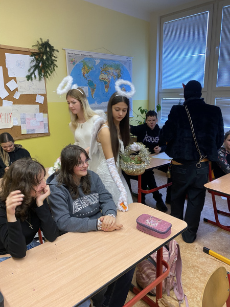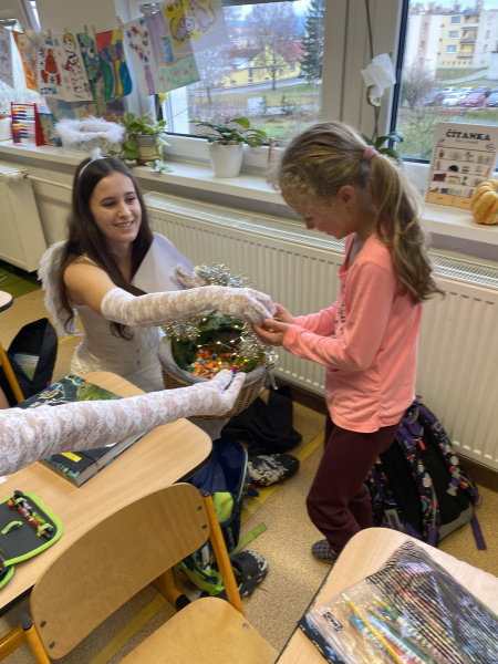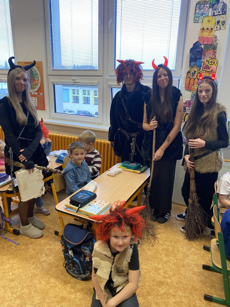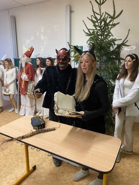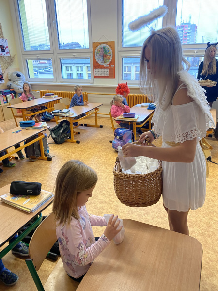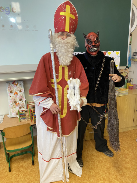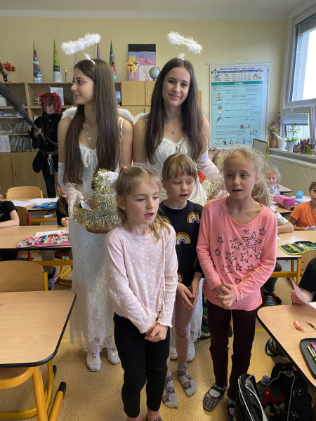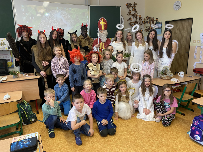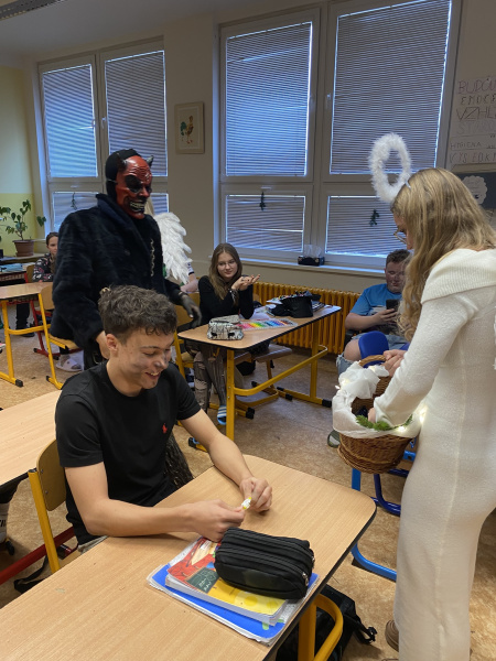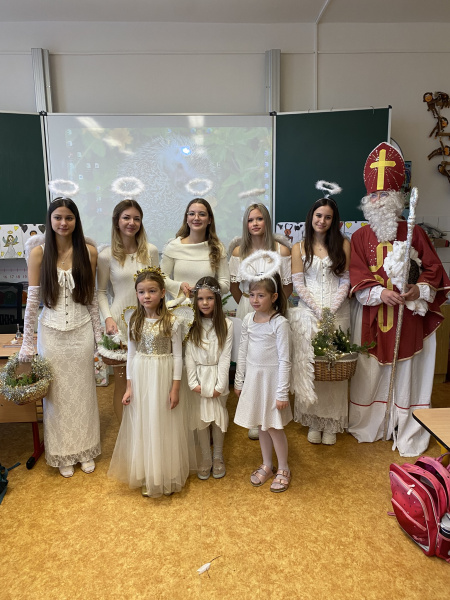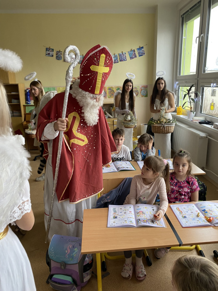 V pátek 5.12. 2025 se na chodbách naší školy začaly dít podivné věci. Dorazila totiž tradiční delegace Mikuláše, andělů a samozřejmě také čertů, kteří jako vždy přišli prověřit, jak si žáci naší školy vedou se slušným chováním a jak pevné mají nervy. Kolem Mikuláše poletovali andělé, rozdávali nejen úsměv, ale i bonbóny. Sladkosti dostaly především děti, které se dostaly na seznam v „Knize andělů“. A věřte, že dostat se na takový seznam není vůbec jednoduché.